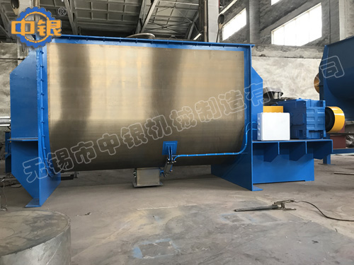 臥式螺帶混合機以高效、快速混合物料、由攪拌軸的螺旋帶運動下,使內外螺旋帶在較大范圍內翻動物料,內螺旋帶將物料向兩側運動,外螺旋帶將物料由兩側向內運動,使物料來回滲混,另部分物料被螺旋帶推動下,沒軸向徑向運動,從而形成對流循環。由于上述運動的攪拌,物料在較短時間內獲得快速均勻混合。